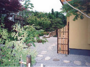細めの竹を使った鉄砲垣の袖垣がより一層奥行を強調。屋根の勾配に合わせ竹垣の天端も斜めにし建物と一体感を