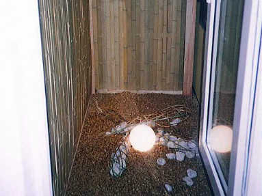 浴室から臨む室内庭園は割竹の木賊張り、竹の蛇籠のオブジェ、ライト、敷き砂利で構成