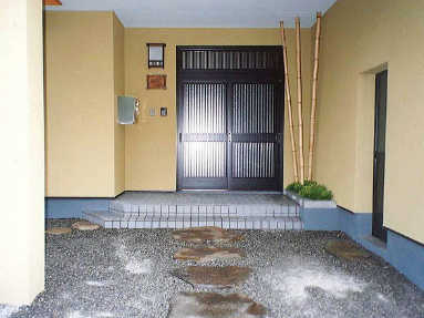 重厚感ある大きな飛び石のアプローチ。また玄関袖の植樹枡は飾りの竹と下草で演出。