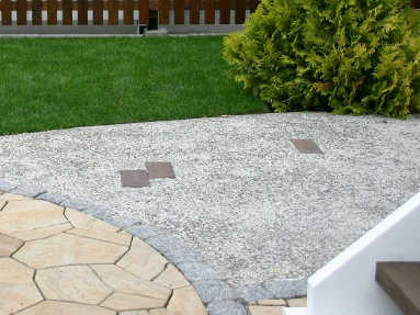 コンクリートに小石を錬り込んで表面のモルタルを洗い流して表情豊かな舗装に。